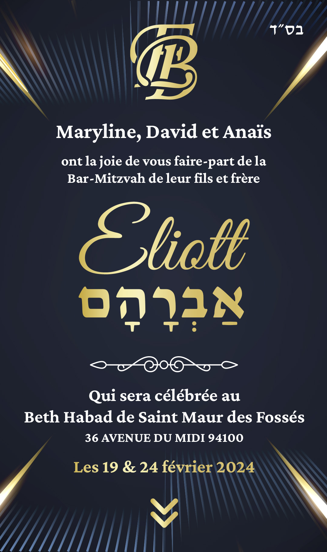 le Samedi 24 février 2024 à 9h30 L'office sera suivi d'un Kiddouche
